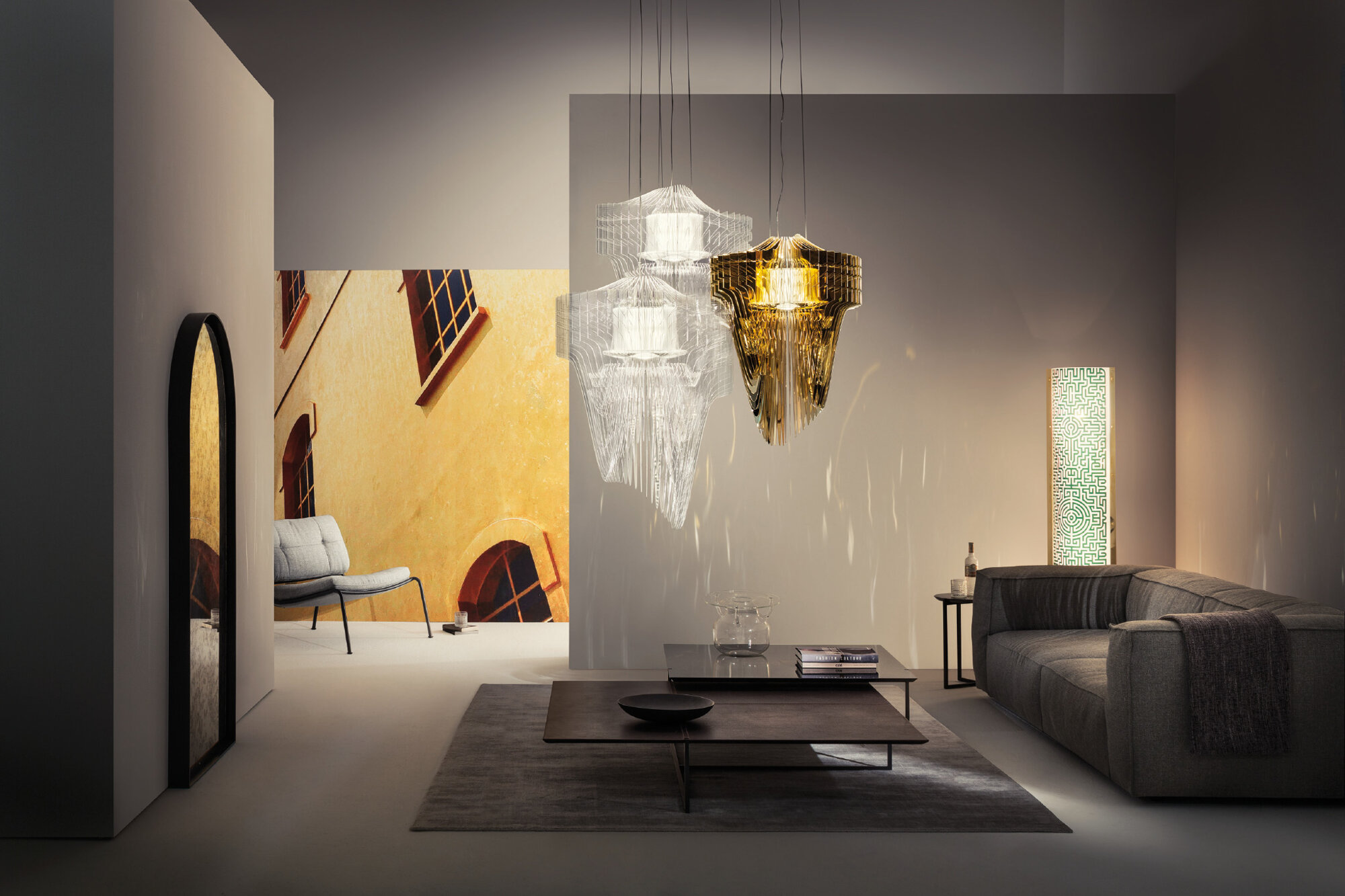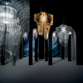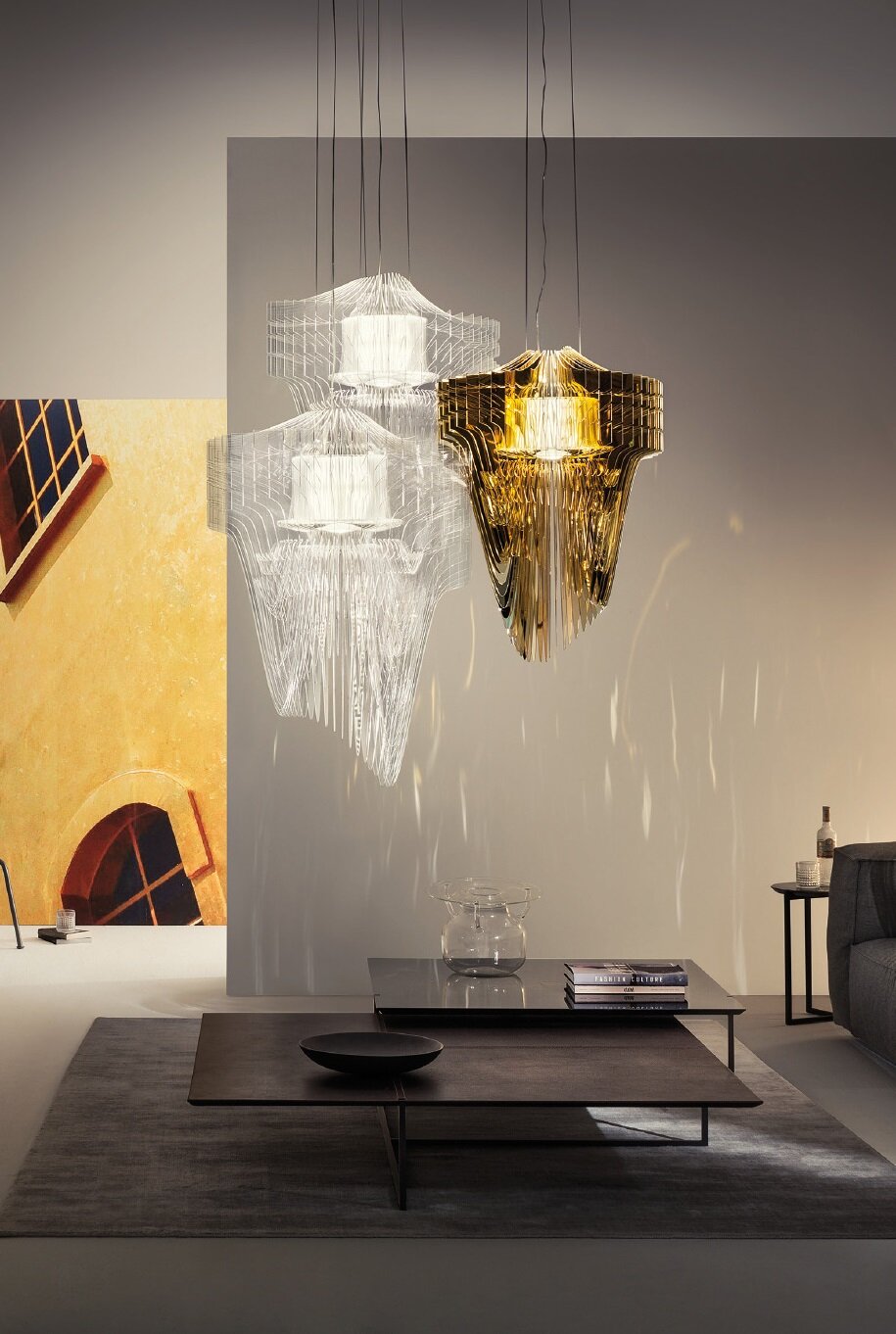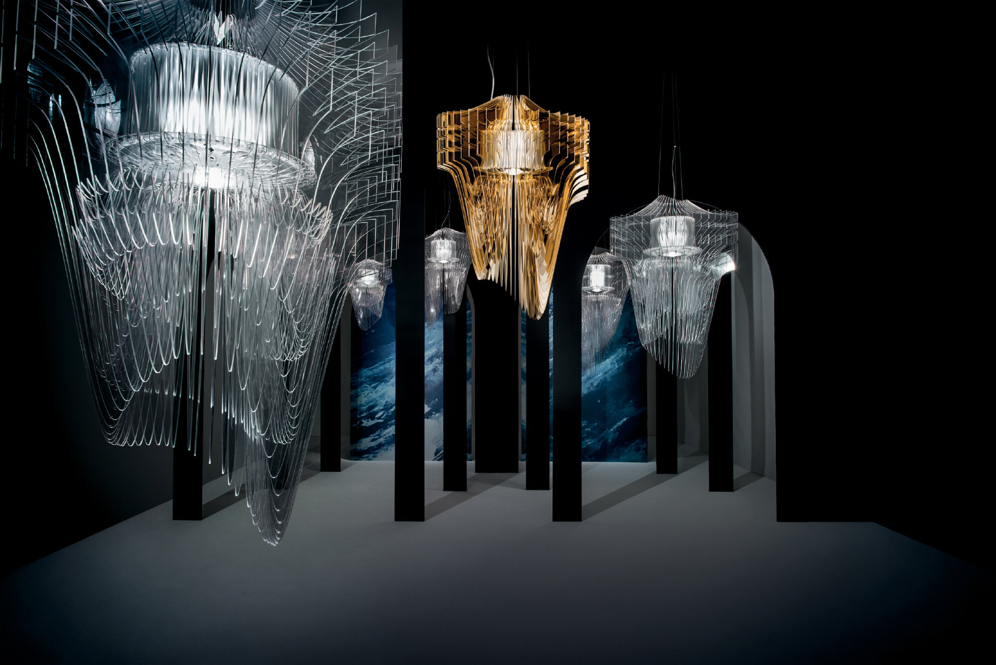 Zaha Hadid’s luminous architecture is visionary, fluid and dynamic, infusing the revolutionary and iconic semantics of the celebrated architect into domestic and public interiors; the result is the harmonization of beings and their surrounding spaces. From the new metallized Gold (50, 60 and 70 cm), the original version with shaded black edges (Ø90 cm), to the ethereal transparent, polycarbonate versions, Hadid’s masterpieces consist of 50 “arms”, each diverse from the others, radiating around a voluminous LED source.