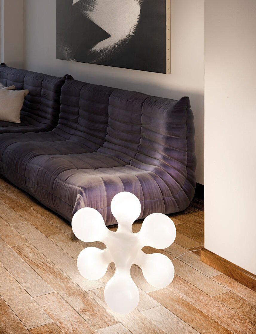 Table and floor lamp with rotational-moulded polyethylene diffuser and inner structure with six light sources fixed on steel coil springs.