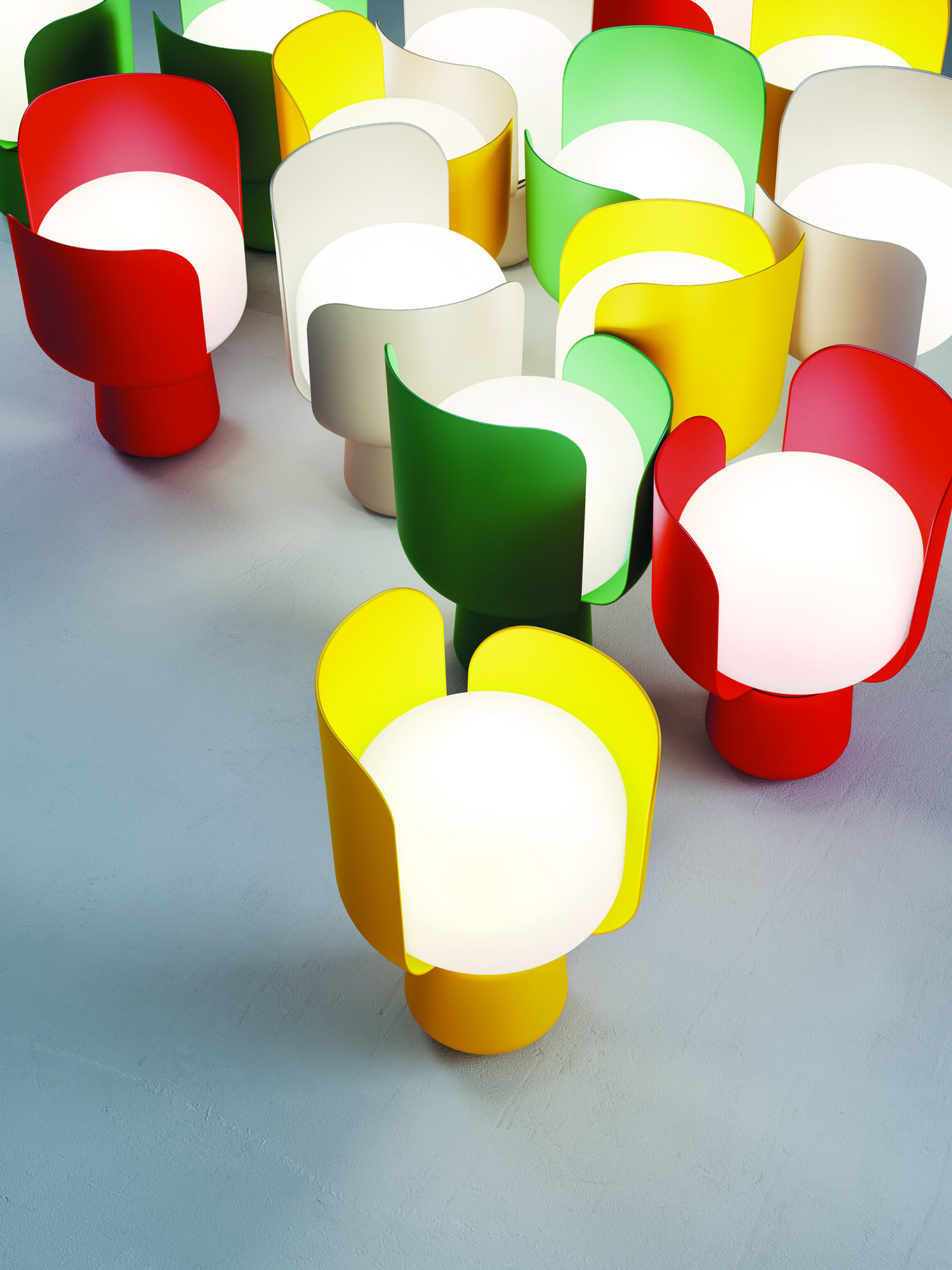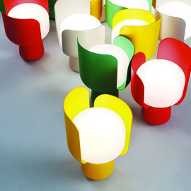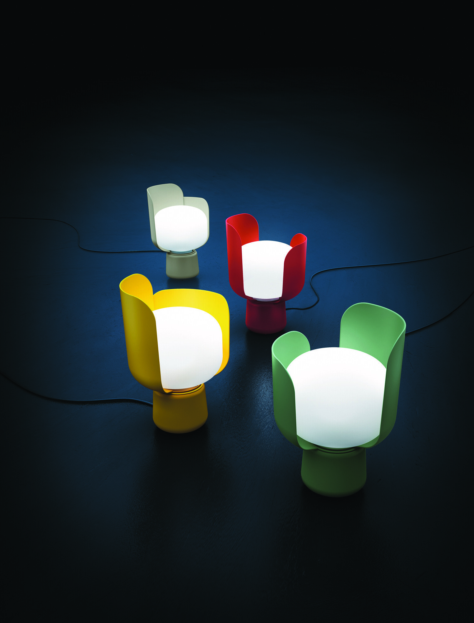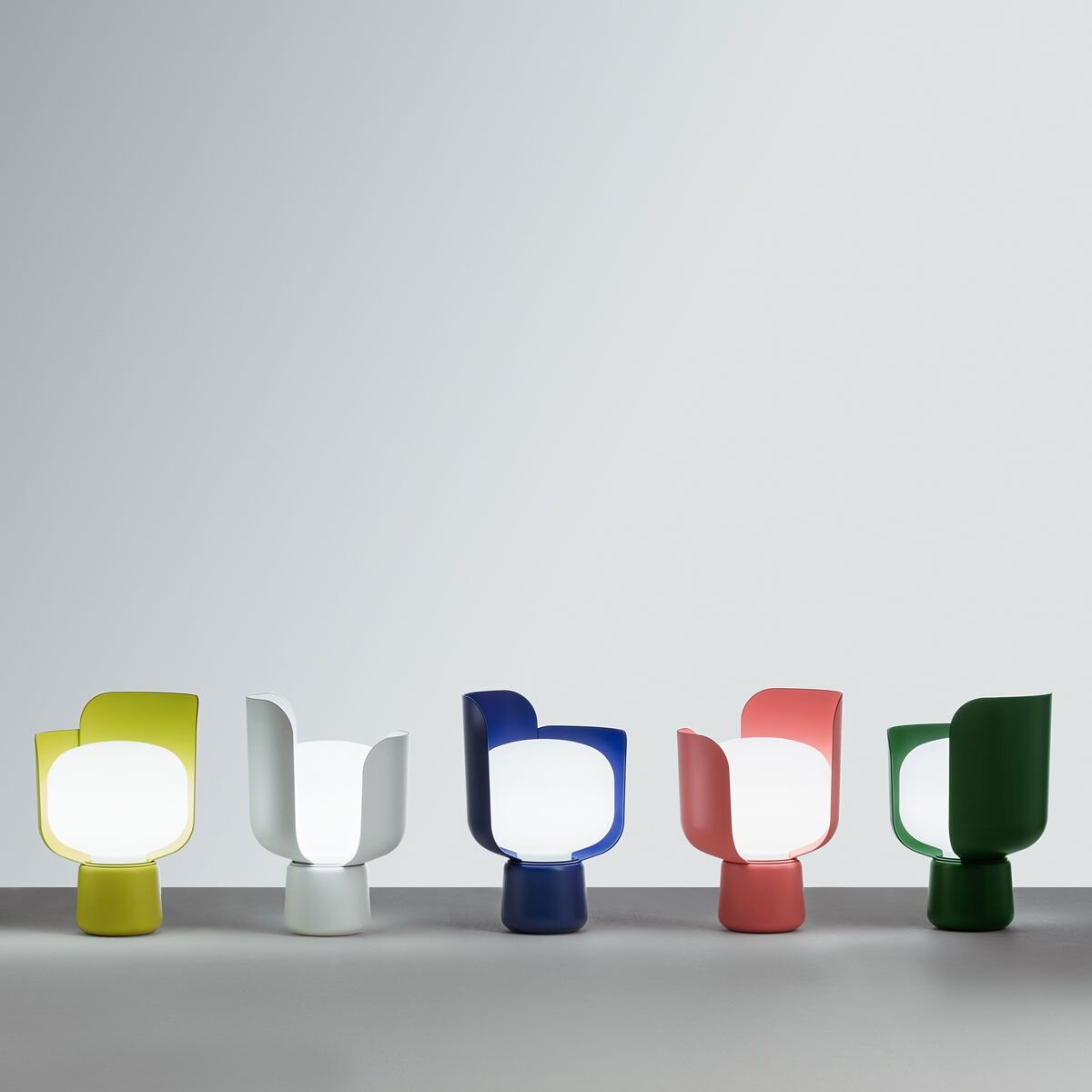 Blom is a small table lamp by Andreas Engesvik, a Norwegian designer who has made a name for himself on the international scene thanks to his ability to instil emotions, appeal and ideas into everyday objects. Taking up very little space, just 24 cm tall with a diameter of 15 cm, Blom is a light, fun lamp that is easy to pick up and move and suitable for any purpose. Its name, a contraction of the word blomst, which in Norwegian means flower, is inspired by its petal shaped blades. Intensity can be adjusted thanks to the two petals that gently embrace the diffuser, rotating on the base to shield the glare depending on personal requirements: with the petals aligned the lamp emits maximum light.
