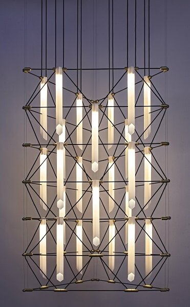 A three-dimensional, three-dimensional luminaire panel, as well as a prism, provides this cool contemporary chandelier with pleasant light and backlighting of the interior color.