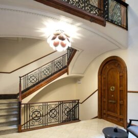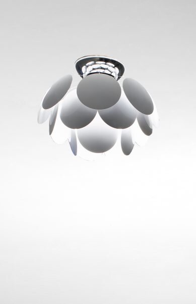Exuberant even when turned off, the richness of the light issuing from the Discocó lamp provides direct downward illumination along with a dramatic play of lights and soft shadows. Its detailed study of incident light and light that bounces off of both sides of the disks provide the lamp with an appealing gradation of light nuances and depth. Further reflections dance off the chrome-covered semi-sphere at the core, where the disks are anchored. When the light is turned off, it retains its attractive presence, hinting at the expansion of energy that is fully expressed when it is turned on.