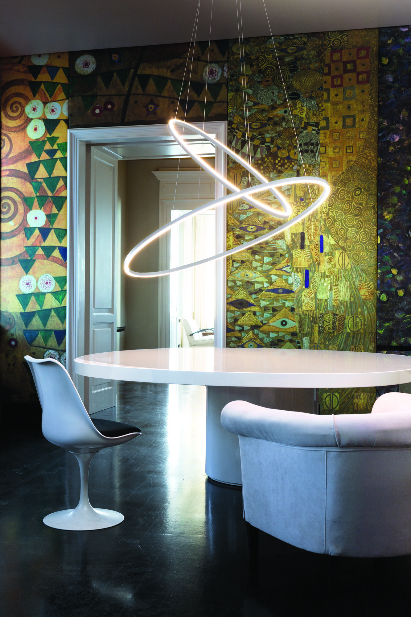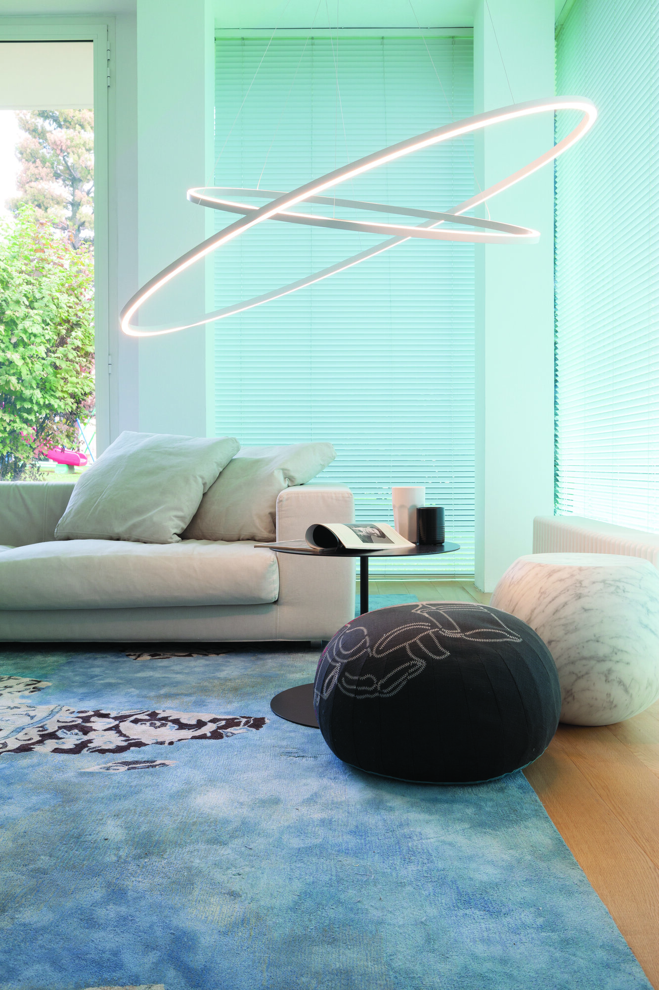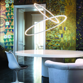 LED pendant lamp, available in three versions: major, minor and double, widespread direct or indirect lighting. Extruded aluminium, matt white, matt black painted, polished or glossy gold anodized. Opaline diffuser. Ellisse is manufactured through a proprietary technology to combine the extruded bars (patent pending). Major version available also for wall and floor applications, with a marble base on the floor version and with a wall kit mounting on the wall one.
