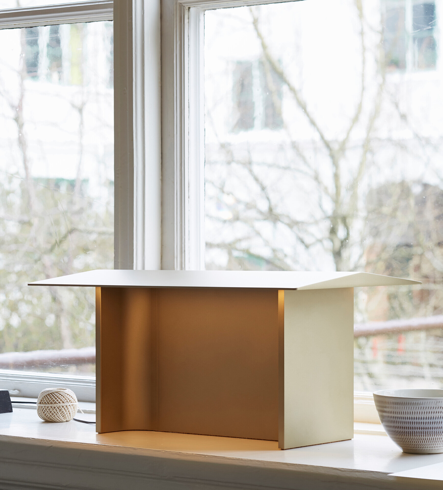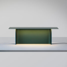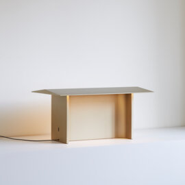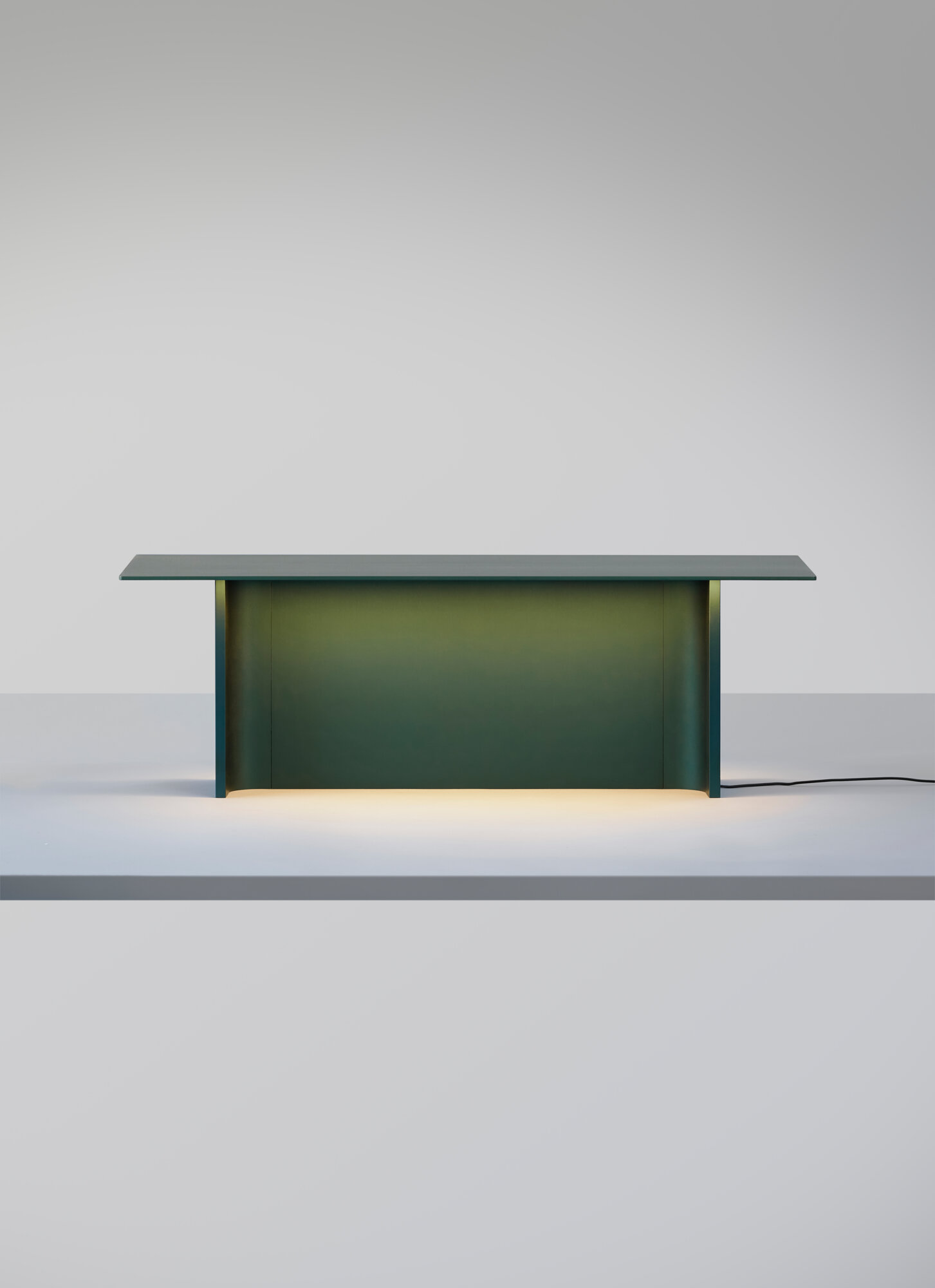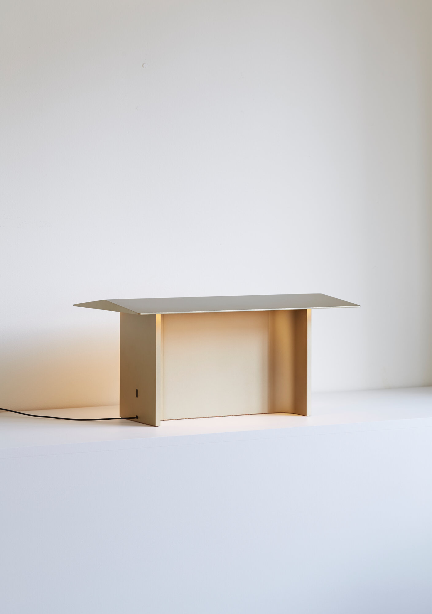 The table version can be used with a touch-sensor dimmer. The LEDs are placed under the roof to project soft, warm light onto the surface below as well as along the central wall and the lateral posts. The luminous effect produced on the vertical surfaces is of the wall-washer type while the light reflected from the table top creates a poetic luminous cloud. The facades of the lamp and the lateral ends have been envisioned by Rybakken as a sort of delicately lit stage, a place for cherished objects, giving rise to unusual compositions of light and shadow, colors and materials.