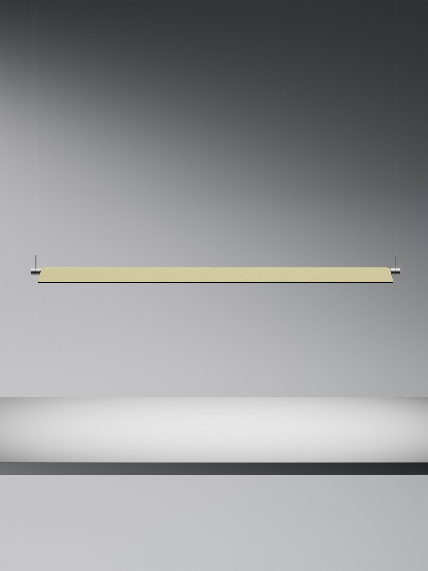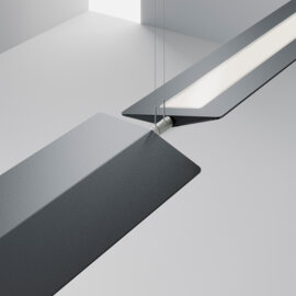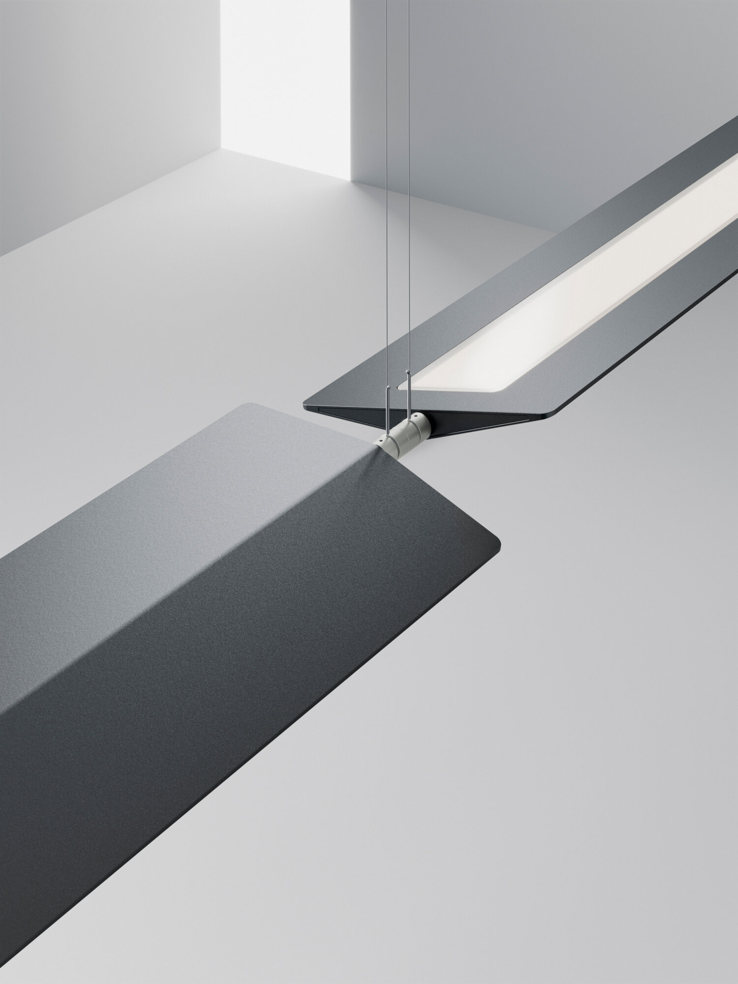 The suspension version is made in a single size for the roof, whose lower portion contains a homogeneous light source for high performance without glare. The lamp provides light directed upward and downward, thanks to great freedom of movement, permitting rotation of 360 degrees. It is possible to connect up to four suspension lamps with a single power cord, conserving the rotation of each unit.