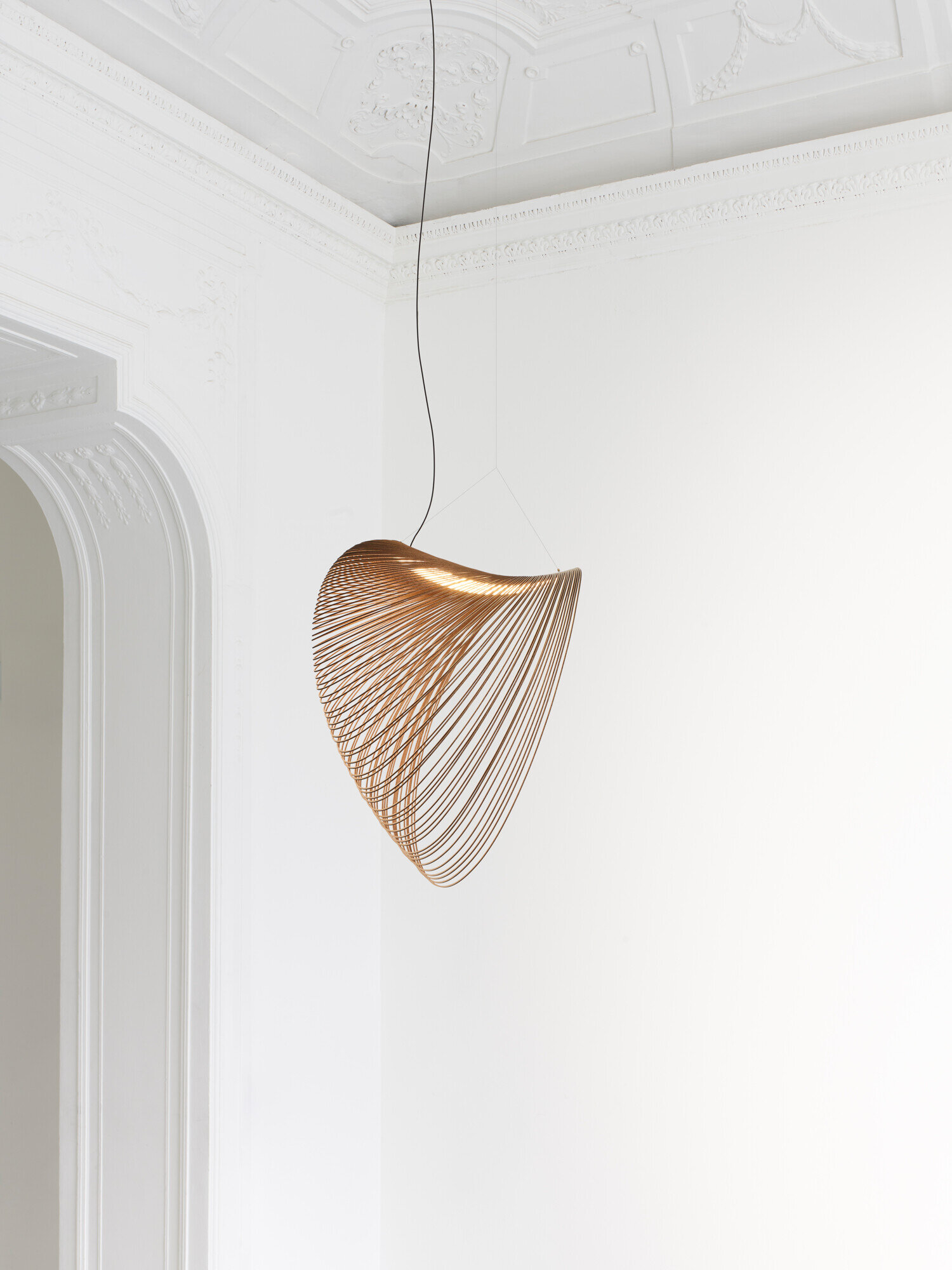 Illan has an ethereal, lively design that is conditioned by the rolling air movement, constant changes that shape and shape the light volume. It consists of a very lightweight body made of extremely thin, flexible plywood, laser cut along the densely packed same lines.