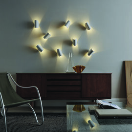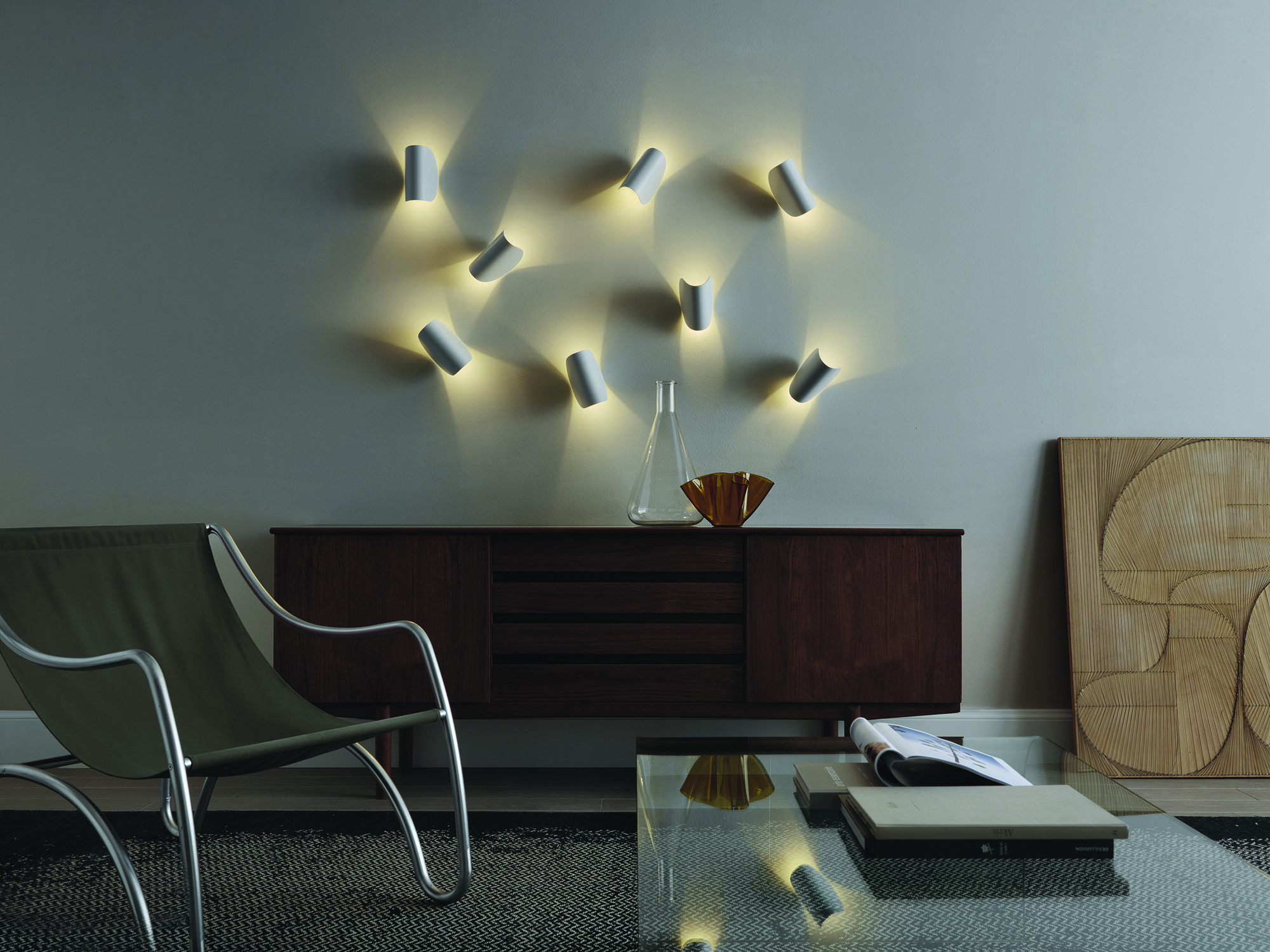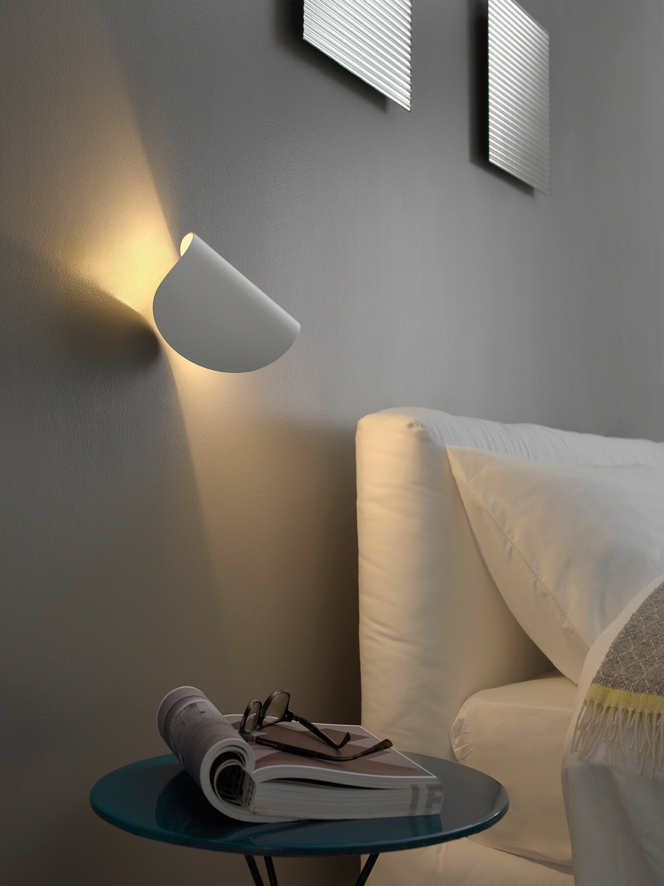 In the shape of a small curved lunar disc, IO is a wall light with dual Led light emission. IO appears almost suspended, very close to the wall but never close enough to touch it; positioned at a distance that allows the light to gently caress the wall with an intimate skimming effect. Elegant and minimalist, it is equipped with a mount with a dual rotating axis. is allows the diffuser to be rotated by 360°, directing it exactly where the light is required. In addition to rotating, the diffuser also moves up and down, opening and closing the light beams to adjust to individual requirements.