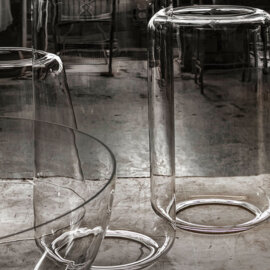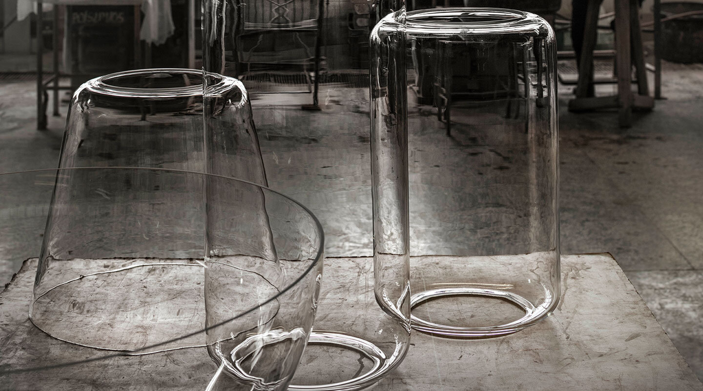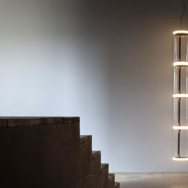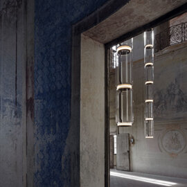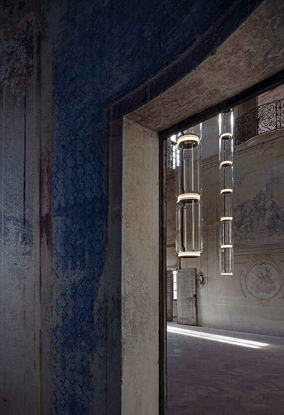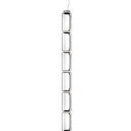 Hanging lamps consisting of interconnecting glass modules reaching a length of 3,2 mt. (126.77") with 4 mt. (157.48") suspended power cable. Cylindrical and semi-spherical transparent blown glass structure, suspended die cast aluminium ring connector, hydroformed steel internal lateral arm and injection moulded optical opal silicone outer ring diffusers.