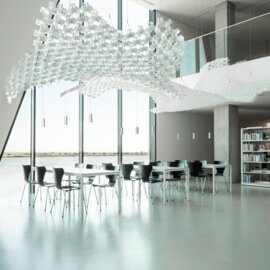 “We didn’t make a lamp, we made a ceiling”. Miguel Arruda introduces his work with Slamp with these words. The modular system started from the symbology he applied to a sculpture in 1980; Slamp’s R&D team transformed it, creating folded and jointed, meter-long hexagonal sections to be infinitely combined, filling a space with floating landscapes. Nuvem is a “ceiling”, illuminated by bidirectional spotlights (GU10)