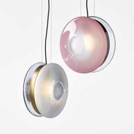 Orbital paths of multicolored celestial bodies with hypnotically glowing cores. This ingenious design of hand-blown glass lenses, held together by a metal mounting, creates a fascinating visual experience from different angles.