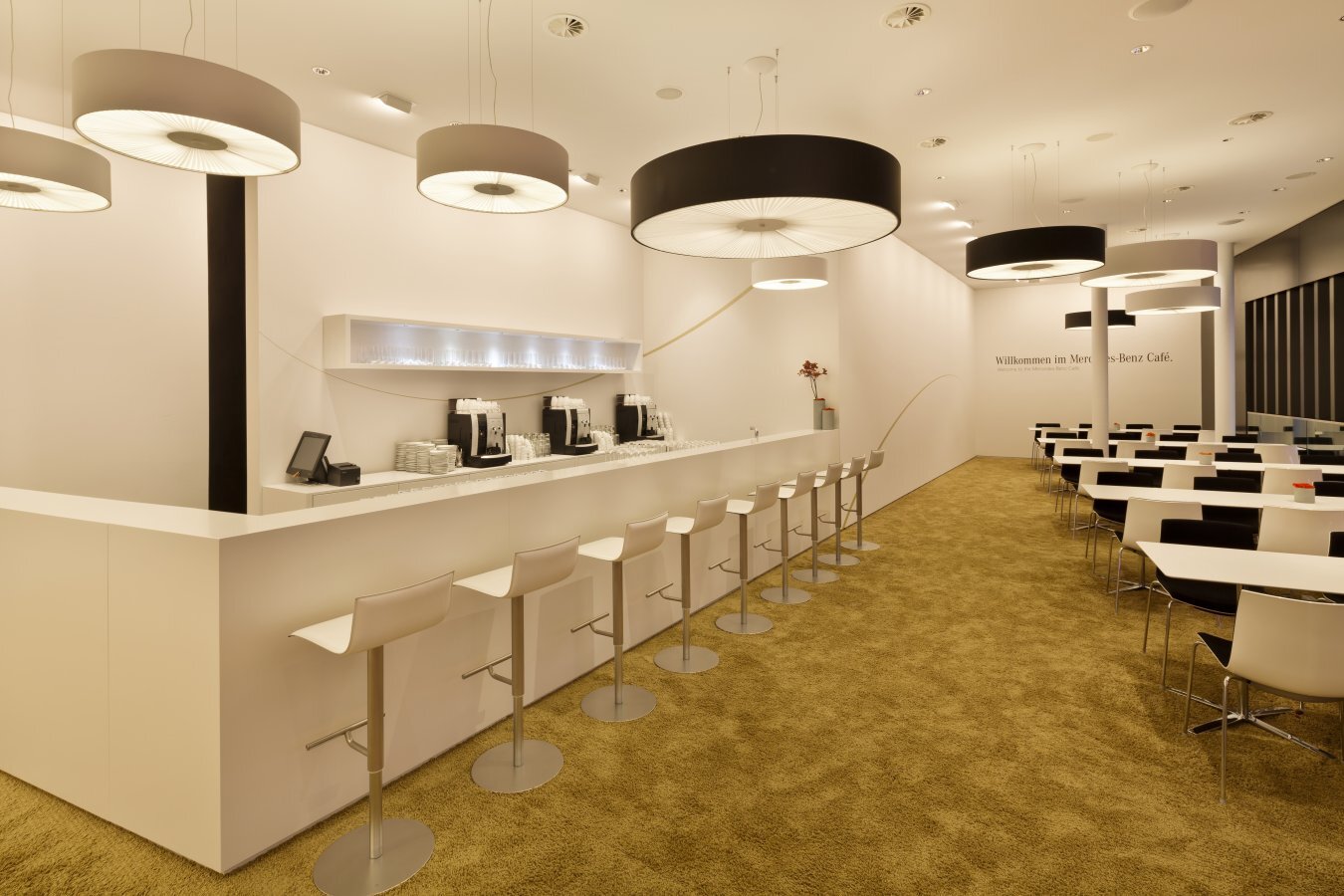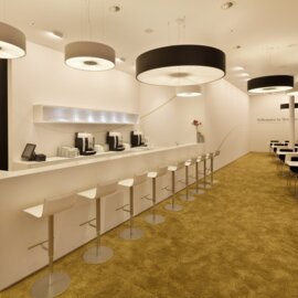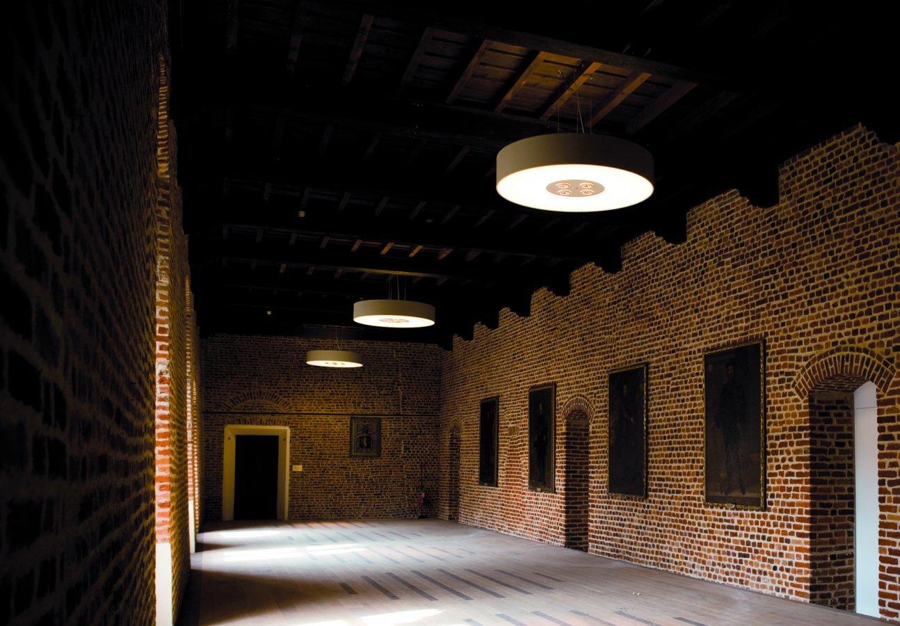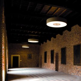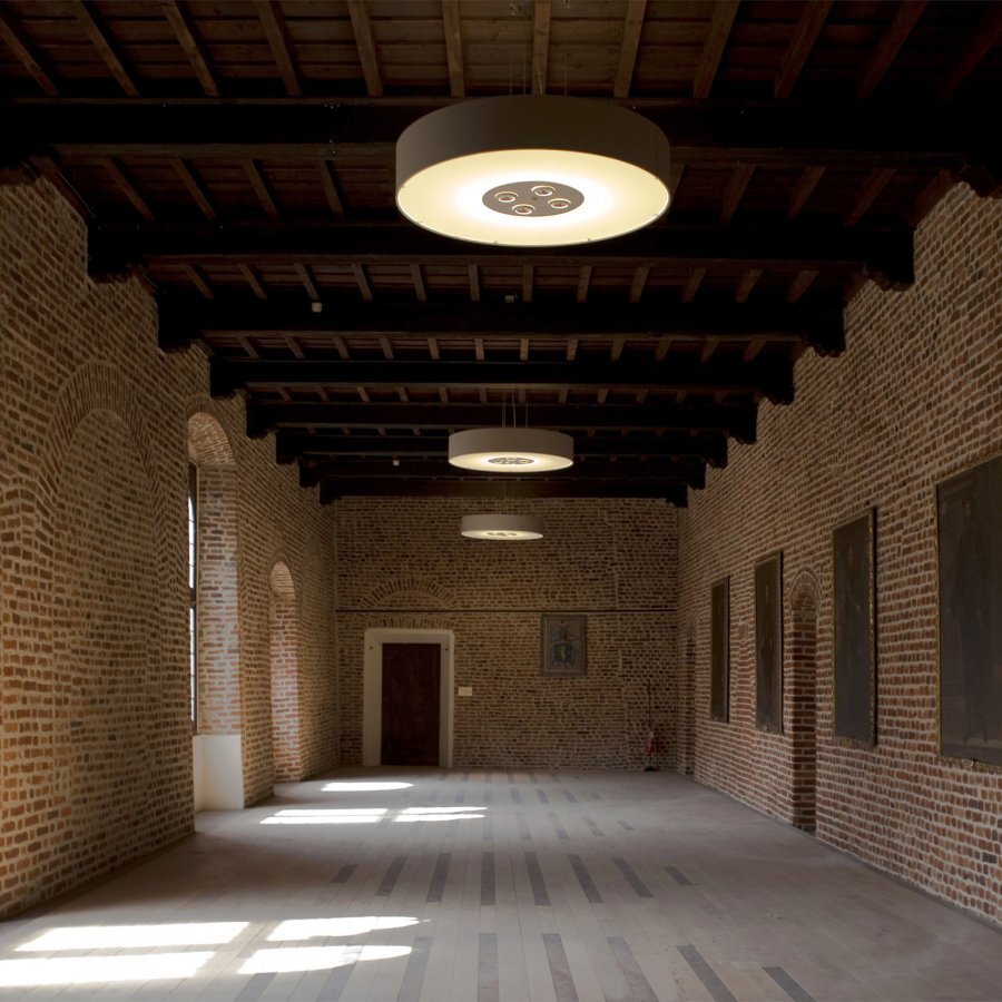 Collection consisting of ceiling lamps and suspended lamps. The lampshade is covered with flame-retardant eco-leather. Available in several colours and sizes. Screw fitting or built-in dimmable LED light source.