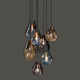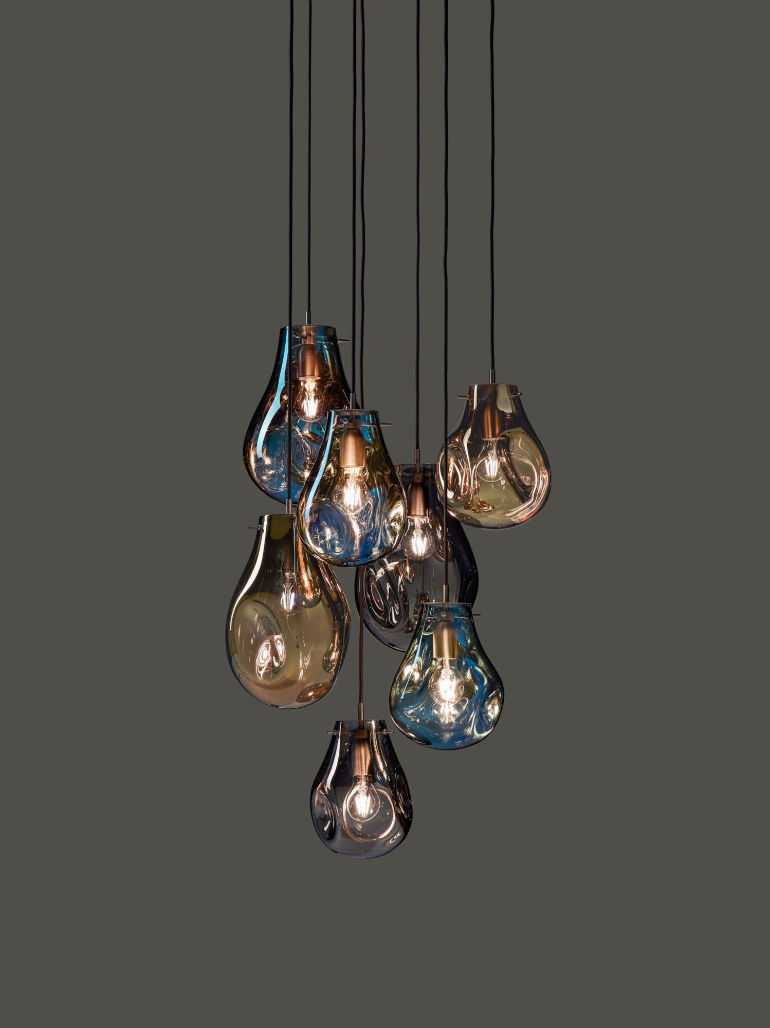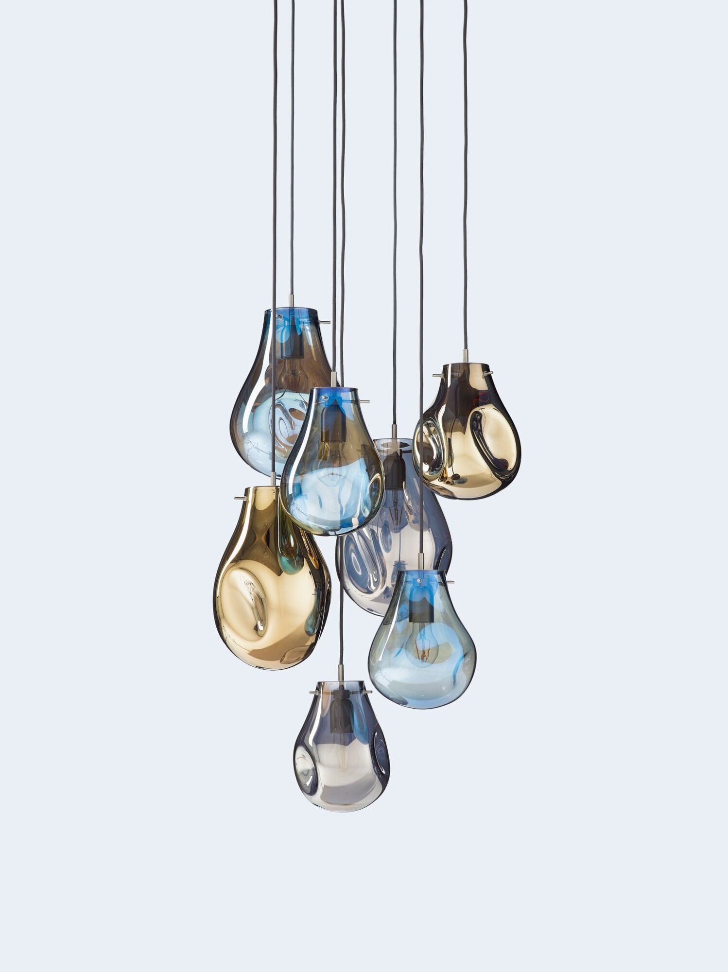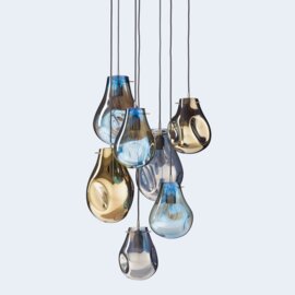 Varying colors, transparency and continuously changing shapes – the characteristic features of soap bubbles, inspired this collection. Lighted, their metallic sheen magically transforms to iridescent and translucent. Each piece is hand-blown without a mold, producing an original in both shape and color.