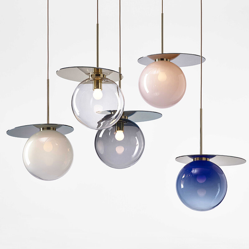 Inspired by the relationship between geometric objects and their shadows, the Umbra collection features elegant pendants in sophisticated detail. Its metal plate derives from the perfectly elliptical shadow cast by a side-lit ball, mirroring the colorful mouth-blown crystal piece.